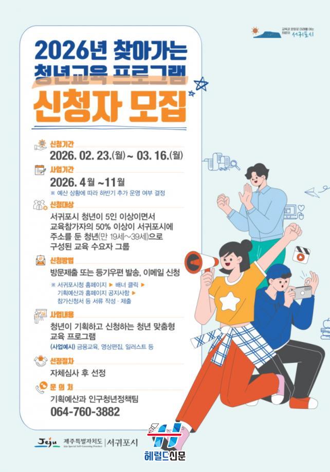 [Çì·²µå½Å¹® = ³ë½Â¾ð ±âÀÚ] ¼±ÍÆ÷½Ã´Â û³âÀÇ Áö¼Ó°¡´ÉÇÑ ¼ºÀå°ú Àڱ⠰è¹ßÀ» Áö¿øÇϱâ À§ÇØ ¿À´Â 23ÀϺÎÅÍ ´ÙÀ½ ´Þ 16ÀϱîÁö ¡®2026³â ã¾Æ°¡´Â û³â±³À°¡¯ ÇÁ·Î±×·¥ Âü¿©ÀÚ¸¦ ¸ðÁýÇÑ´Ù°í ¹àÇû´Ù.