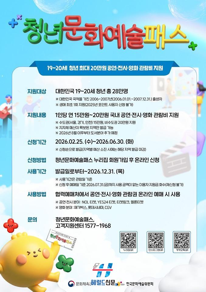 ½Åû±â°£Àº 2¿ù 25ÀϺÎÅÍ 6¿ù 30ÀϱîÁöÀ̸ç, û³â¹®È¿¹¼úÆÐ½º ´©¸®Áý(www.youthculturepass.or.kr)¿¡¼ °¡´ÉÇÏ´Ù. Áö¿ø±ÝÀº ¿ÃÇØ ¸»±îÁö »ç¿ëÇÒ ¼ö ÀÖÀ¸³ª, 7¿ù 31ÀϱîÁö ÀÌ¿ë ³»¿ªÀÌ ¾øÀ» °æ¿ì ÀÚµ¿ ȸ¼öµÇ¹Ç·Î À¯ÀÇÇØ¾ß ÇÑ´Ù.