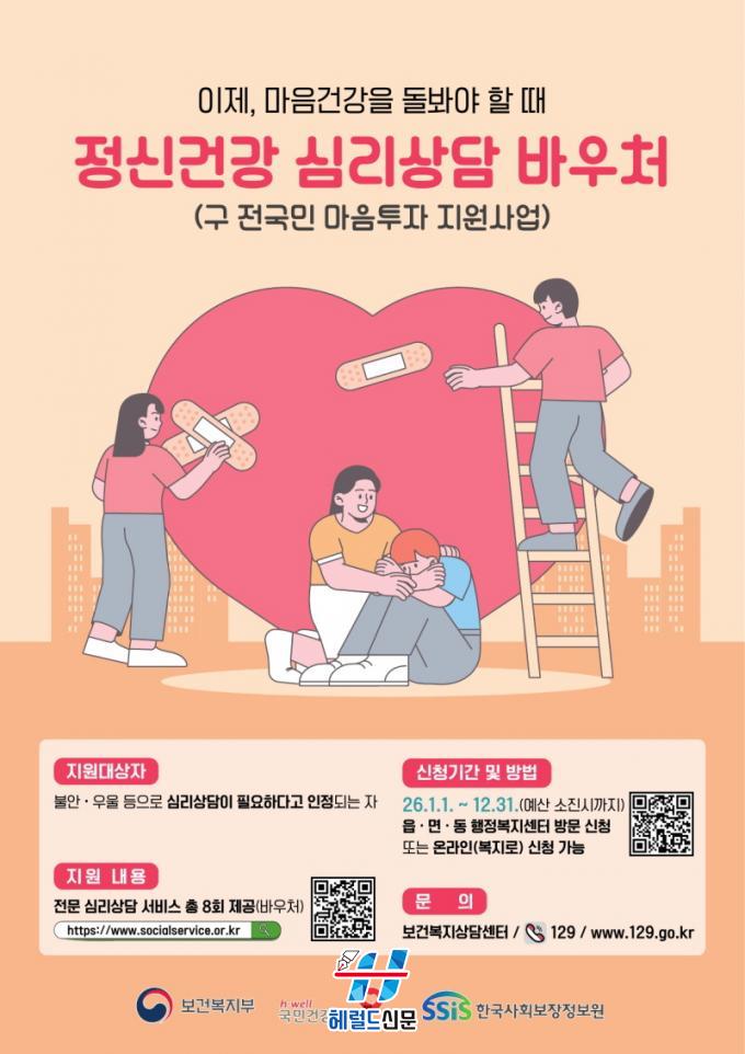 10¡¤29ÀÌÅ¿øÂü»ç, 12¡¤29¿©°´±âÂü»ç µî »çȸÀû Àç³À» °ÞÀº º»ÀÎ ¶Ç´Â À¯°¡Á·Àº Áö³ÇØ¿¡ ÀÌ¾î ¿ÃÇØ¿¡µµ ¼ºñ½º¸¦ Áö¿ø¹ÞÀ» ¼ö ÀÖ´Ù. º»Àκδã±ÝÀº 2026³â °Ç°º¸Çè·á »êÁ¤±âÁØÇ¥¸¦ Àû¿ëÇØ Àü¿ù ³³ºÎÇÑ °Ç°º¸Çè·á¸¦ ±âÁØÀ¸·Î Ã¥Á¤Çϸç, 1ȸ´ç ÃÖ´ë 4¸¸¿øÀ» ºÎ´ãÇϸé 8ȸÀÇ ½É¸®»ó´ã ¼ºñ½º¸¦ ¹ÞÀ» ¼ö ÀÖ´Ù.