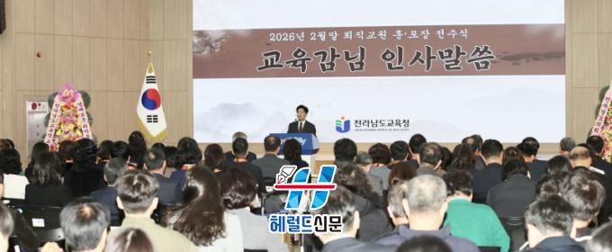 [Çì·²µå½Å¹® = ³ë½Â¾ð ±âÀÚ] Àü¶ó³²µµ±³À°Ã»(±³À°°¨ ±è´ëÁß)Àº 2¿ù 27ÀÏ Ã»»ç ´ëȸÀǽǿ¡¼ 2026³â 2¿ù¸» ÅðÁ÷±³¿ø ÈÆ¡¤Æ÷Àå Àü¼ö½ÄÀ» °³ÃÖÇß´Ù.