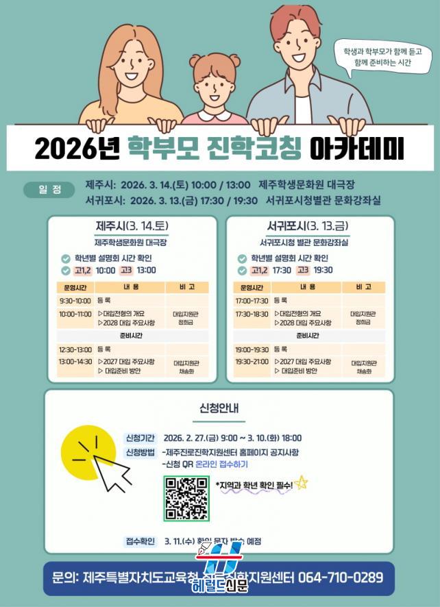 [Çì·²µå½Å¹® = ³ë½Â¾ð ±âÀÚ] Á¦ÁÖÆ¯º°ÀÚÄ¡µµ±³À°Ã»Àº ´ëÀÔ Á¤º¸ Á¦°øÀ» À§ÇÑ ¡®2026³â Çкθð ÁøÇÐÄÚĪ ¾ÆÄ«µ¥¹Ì¡¯¸¦ ³»´Þ 13ÀÏ(±Ý) ¼±ÍÆ÷½Ãû ¹®È°Á½ǰú 14ÀÏ(Åä) Á¦ÁÖÇлý¹®È¿ø¿¡¼ °³ÃÖÇÑ´Ù.