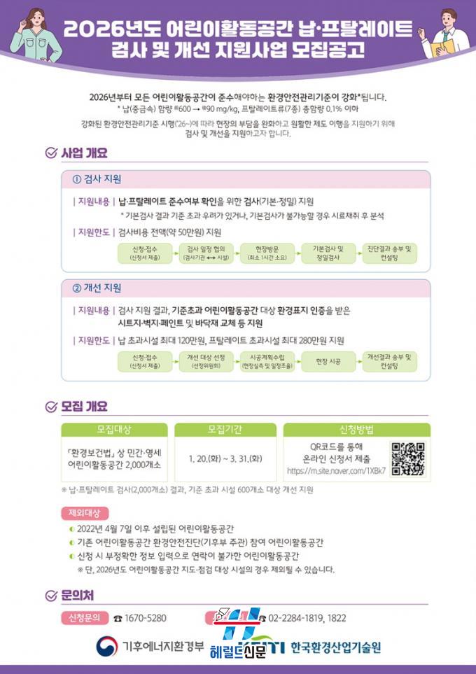 [Çì·²µå½Å¹® = ³ë½Â¾ð ±âÀÚ] ¿©¼ö½Ã´Â ȯ°æ¾ÈÀü°ü¸®±âÁØ °È¿¡ µû¶ó ¡®2026³âµµ ¾î¸°ÀÌȰµ¿°ø°£ ³³¡¤ÇÁÅ»·¹ÀÌÆ® °Ë»ç ¹× °³¼± Áö¿ø»ç¾÷¡¯°ú °ü·ÃÇØ °ü³» ¾î¸°ÀÌÁý¿¡ ±âÇÑ ³» ½ÅûÀ» ´çºÎÇß´Ù.