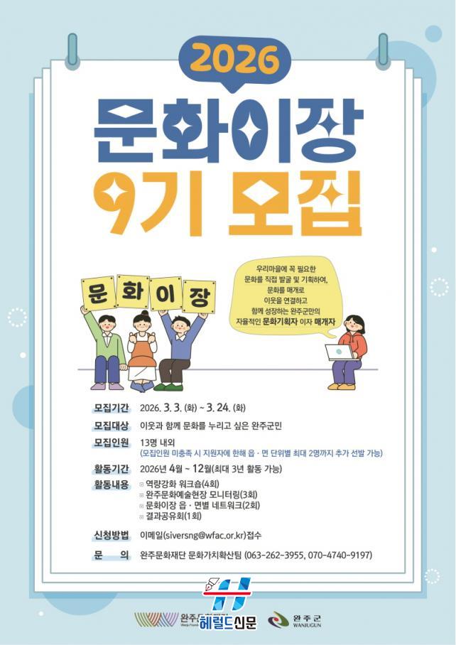 [Çì·²µå½Å¹® = ³ë½Â¾ð ±âÀÚ] (Àç)¿ÏÁÖ¹®ÈÀç´ÜÀº Áö¿ª ¹®È Ȱ¼ºÈ¸¦ À̲ø¾î°¥ ¡¸2026 ¹®ÈÀÌÀå 9±â¡¹ 13¸íÀ» ¿À´Â 3¿ù 24ÀϱîÁö ¸ðÁýÇÑ´Ù.
