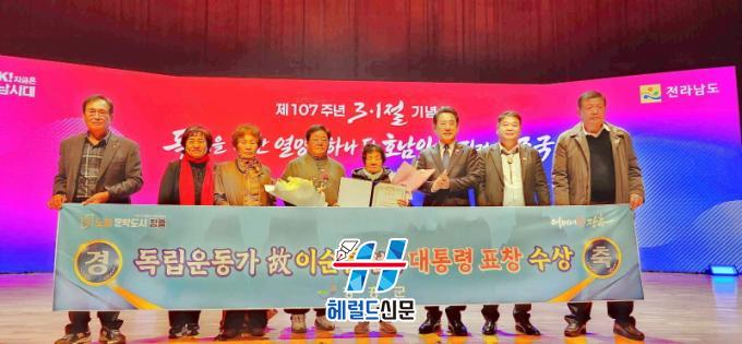 Áö³ 3¿ù 1ÀÏ Àü³²µµÃ» ±è´ëÁß°´ç¿¡¼ ¿¸° Á¦107ÁÖ³â 3¡¤1Àý ±â³ä½Ä¿¡¼´Â ÀåÈï Ãâ½Å °í(ͺ) À̼øÈì ¼±»ý(1908.2.13.~1985.6.1.)ÀÌ µ¶¸³À¯°øÀÚ ´ëÅë·É ǥâÀ» ¼ö»óÇß´Ù.