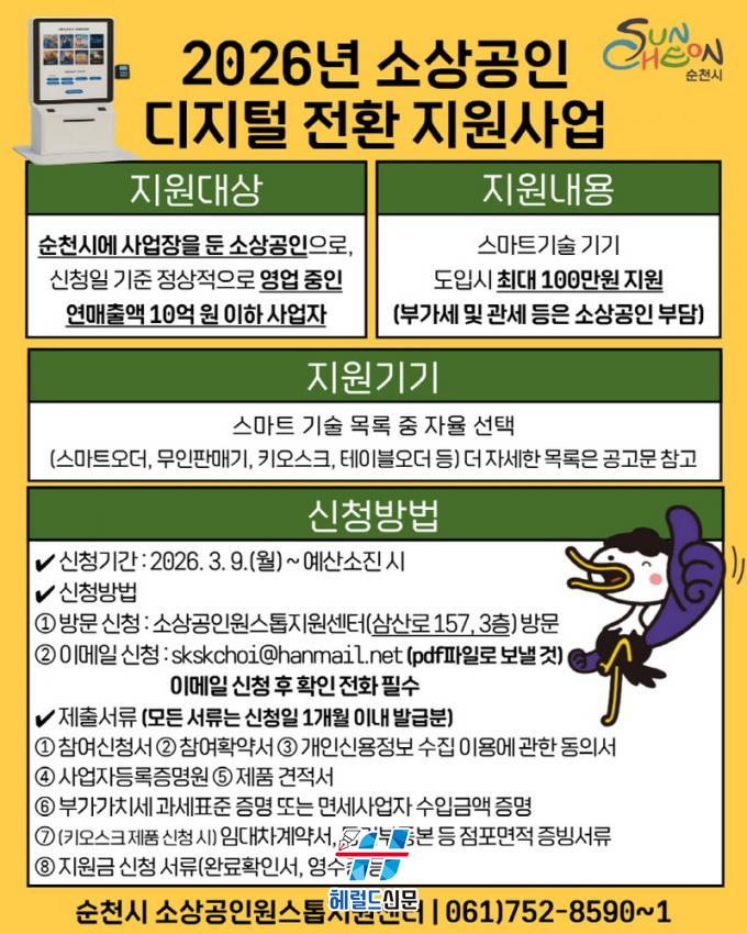 [Çì·²µå½Å¹® = ³ë½Â¾ð ±âÀÚ] ¼øÃµ½Ã´Â ¿Â¶óÀÎ ÁÖ¹® È®´ë¿Í ºñ´ë¸é ¼Òºñ Áõ°¡ µî µðÁöÅРȯ°æ º¯È¿¡ ´ëÀÀÇØ Áö¿ª ¼Ò»ó°øÀÎÀÇ °æÀï·ÂÀ» ³ôÀ̱â À§ÇÑ ¡®2026³â ¼Ò»ó°øÀÎ µðÁöÅÐ Àüȯ Áö¿ø»ç¾÷¡¯À» º»°Ý ÃßÁøÇÑ´Ù.
