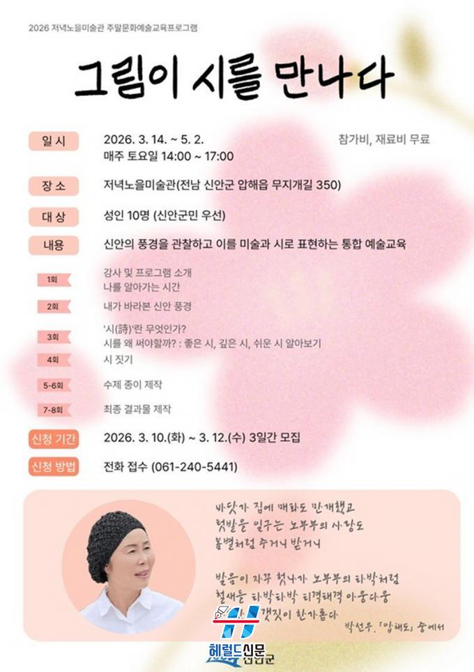 [Çì·²µå½Å¹® = ³ë½Â¾ð ±âÀÚ] ½Å¾È±º Àú³á³ëÀ»¹Ì¼ú°üÀÌ Áö¿ªÀÇ ÀÚ¿¬°ú ÀÏ»óÀ» ¿¹¼ú·Î Ç®¾î³»´Â ÁÖ¸» ¹®È¿¹¼ú±³À°ÇÁ·Î±×·¥ ¡®±×¸²ÀÌ ½Ã¸¦ ¸¸³ª´Ù¡¯¸¦ ¿À´Â 3¿ù 14ÀÏ(Åä)ºÎÅÍ 5¿ù 2ÀÏ(Åä)±îÁö ¿î¿µÇÑ´Ù.