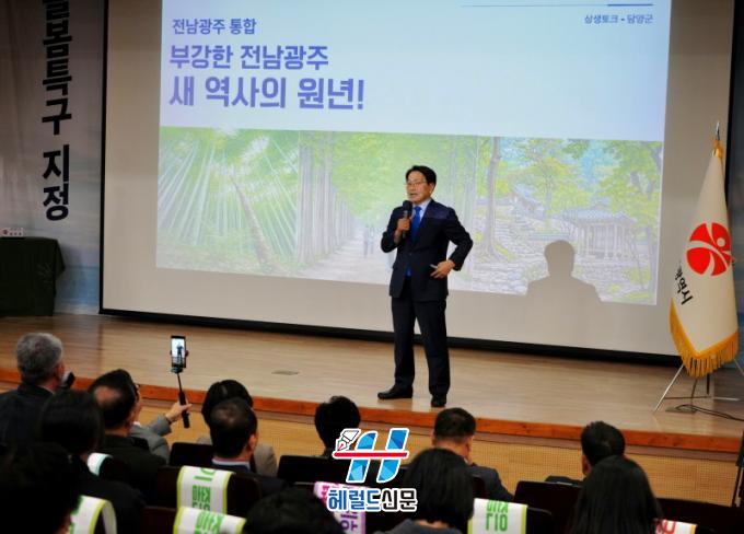°±âÁ¤ ±¤ÁÖ½ÃÀåÀº ¡®Àü³²±¤ÁÖÅëÇÕÆ¯º°½Ã ¼³Ä¡¸¦ À§ÇÑ Æ¯º°¹ý¡¯ÀÇ ÁÖ¿ä ³»¿ë°ú 20Á¶¿ø ±Ô¸ðÀÇ Á¤ºÎ ÀçÁ¤ Áö¿øÀÌ °¡Á®¿Ã º¯È¿¡ ´ëÇØ ¼³¸íÇϰí, ÅëÇÕ ÀÌÈÄ ´ã¾ç±ºÀÇ ¹ßÀüÀü·«À» Á¦½ÃÇß´Ù.