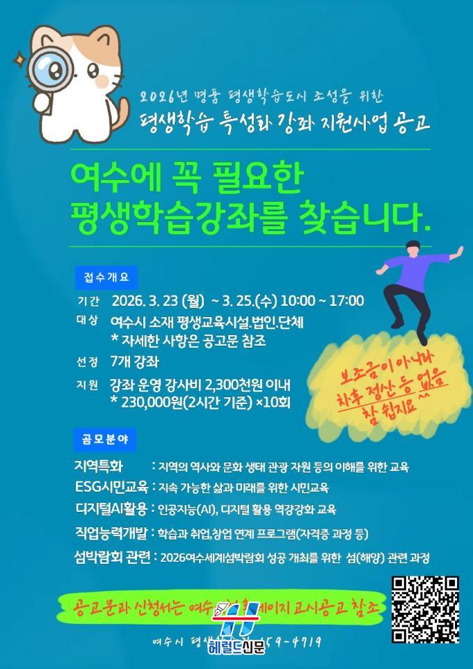 [Çì·²µå½Å¹® = ³ë½Â¾ð ±âÀÚ] ¿©¼ö½Ã´Â ½Ã¹Î »î¿¡ ÇÊ¿äÇÑ ¸ÂÃãÇü Æò»ý±³À° ÇÁ·Î±×·¥À» ¹ß±¼Çϱâ À§ÇØ ¡®2026³â Æò»ýÇнÀ Ư¼ºÈ °Á Áö¿ø»ç¾÷¡¯À» °ø¸ðÇÑ´Ù°í ¹àÇû´Ù.
