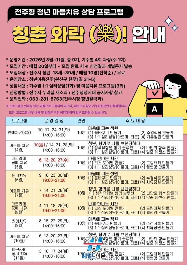 [Çì·²µå½Å¹® = ³ë½Â¾ð ±âÀÚ] ÀüÁֽô Çо÷ ½ºÆ®·¹½º¿Í Ãë¾÷ Áغñ, »çȸÀû °ü°è ´ÜÀý µîÀ¸·Î ½É¸®Àû ¹«±â·ÂÀ» °Þ´Â Áö¿ª û³âµéÀÇ ¸¶À½°Ç°À» µ¹º¸±â À§ÇØ 2026 ÀüÁÖÇü û³â ¸¶À½Ä¡À¯ »ó´ã ÇÁ·Î±×·¥ÀÎ ¡®Ã»Ãá¿Í¶ô(äÅ)¡¯À» º»°Ý ÃßÁøÇÑ´Ù°í 10ÀÏ ¹àÇû´Ù.