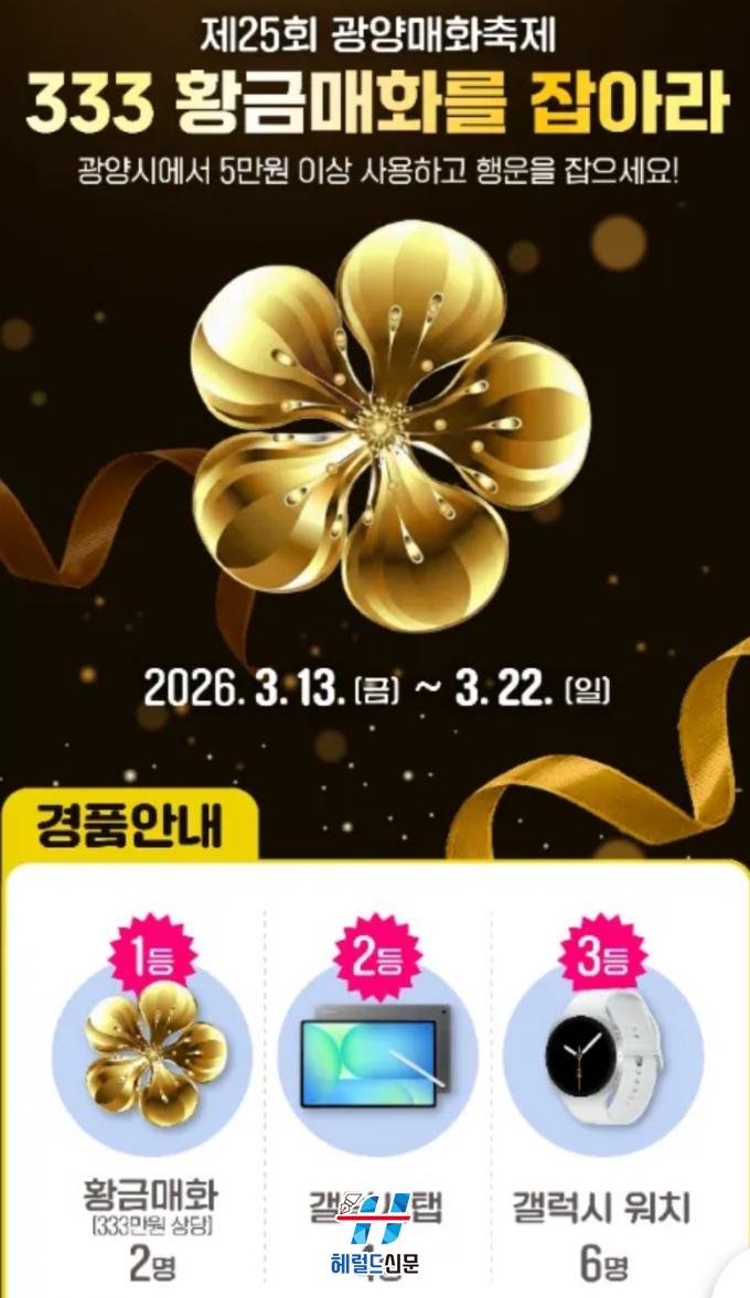 ±¤¾ç½Ã´Â ÃàÁ¦ ±â°£ µ¿¾È ÃÑ 333¸¸ ¿ø »ó´çÀÇ È²±Ý¸Åȸ¦ ¹ÞÀ» ¼ö ÀÖ´Â ¡®È²±Ý¸ÅÈ¡¤¸Å½Ç GET¡¯ À̺¥Æ®¸¦ ºñ·ÔÇØ ¡®Çѱ¹°ü±¤ 100¼± Ž¹æ¡¯, ¡®±¤¾ç¸ÅÈ ½ºÅÆÇÁ Åõ¾î¡¯, ¡®¸ÅÈ±æ °¡º¿î °ÉÀ½(Fun Run)¡¯ µî Âü¿©Çü ÇÁ·Î±×·¥À» ¿î¿µÇÑ´Ù°í ¹àÇû´Ù.