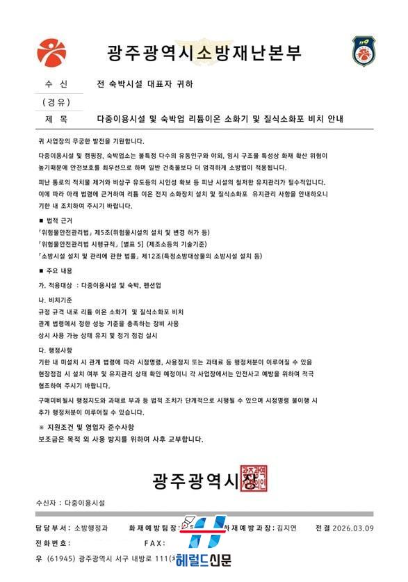 Áö³ 9ÀÏ ±¤»ê±¸ ¼ÛÁ¤µ¿¿¡¼´Â ÇÑ ¼÷¹Ú½Ã¼³ °ü°èÀÚ°¡ ¼ÛÁ¤119¾ÈÀü¼¾Å͸¦ ¹æ¹®ÇØ ¡®¼÷¹Ú½Ã¼³ ÀÚµ¿¼ÒÈÀåÄ¡ ¼³Ä¡ ¾È³»¡¯ °ø¹® ¹ß¼Û ¿©ºÎ¸¦ ¹®ÀÇÇß´Ù. ÀÌ °ü°èÀÚ´Â ¼Ò¹æ±â°ü ¸íÀǸ¦ »ç¿ëÇÑ ¼³Ä¡ ¾È³» °ø¹®À» È®ÀÎÇÏ°í »ç½Ç ¿©ºÎ¸¦ È®ÀÎÇϱâ À§ÇØ 119¾ÈÀü¼¾Å͸¦ ã¾Ò´Ù. ¾È³» °ø¹®Àº ¼Ò¹æ±â°ü¿¡¼ ¹ß¼ÛÇÑ °ø¹®ÀÌ ¾Æ´Ñ °ÍÀ¸·Î È®ÀεÅ, ÀÌ·Î ÀÎÇÑ ÇÇÇØ´Â ¹ß»ýÇÏÁö ¾Ê¾Ò´Ù.