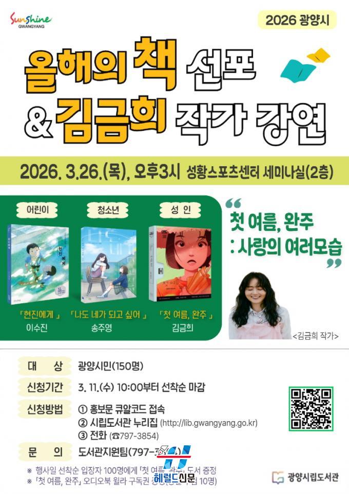 [Çì·²µå½Å¹® = ³ë½Â¾ð ±âÀÚ] ±¤¾ç½Ã´Â ¿À´Â 3¿ù 26ÀÏ ¿ÀÈÄ 3½Ã ¼ºÈ²½ºÆ÷Ã÷¼¾ÅÍ ¼¼¹Ì³ª½Ç(2Ãþ)¿¡¼ ¡®2026 ±¤¾ç½Ã ¿ÃÇØÀÇ Ã¥ ¼±Æ÷½Ä ¹× ÀÛ°¡ ÃÊû °¿¬¡¯À» °³ÃÖÇÑ´Ù.