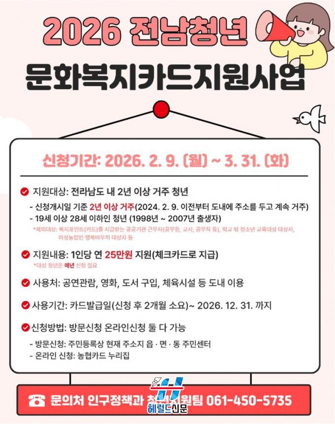 [Çì·²µå½Å¹® = Àü¿µ±Ô ±âÀÚ] ¹«¾È±º(±º¼ö ±è»ê)Àº û³âÀÇ ¹®È»ýȰ°ú ÀÚ±â°è¹ßÀ» Áö¿øÇϱâ À§ÇØ ¡®2026³â Àü³² û³â ¹®Èº¹ÁöÄ«µå Áö¿ø»ç¾÷¡¯ ´ë»óÀÚ¸¦ ¸ðÁýÇϰí ÀÖ´Ù°í ¹àÇû´Ù.