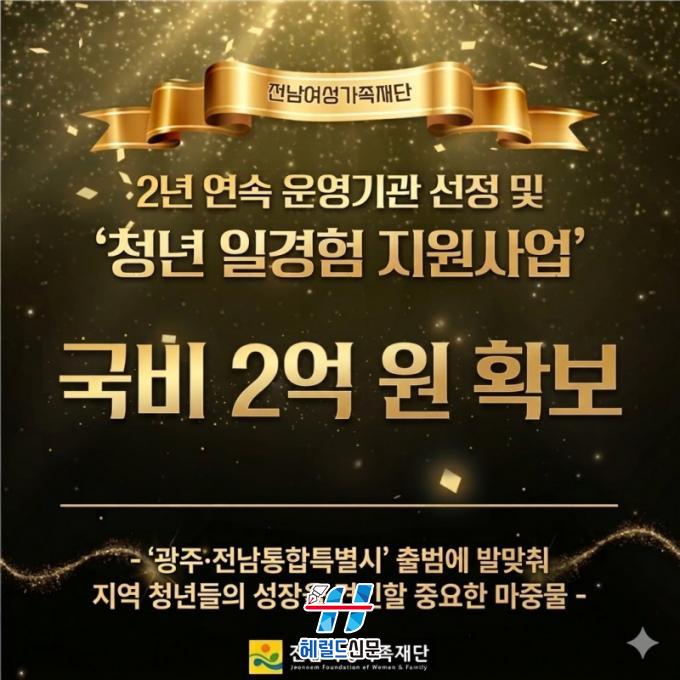 [Çì·²µå½Å¹® = ³ë½Â¾ð ±âÀÚ] Àü³²¿©¼º°¡Á·Àç´ÜÀÌ °í¿ë³ëµ¿ºÎ ÁÖ°ü ¡®2026³â ¹Ì·¡³»ÀÏ ÀϰæÇè Áö¿ø»ç¾÷¡¯ ¿î¿µ±â°üÀ¸·Î 2³â ¿¬¼Ó ¼±Á¤µÇ¾î, ±¹ºñ 2¾ï¿øÀ» È®º¸Çß´Ù°í ¹àÇû´Ù.