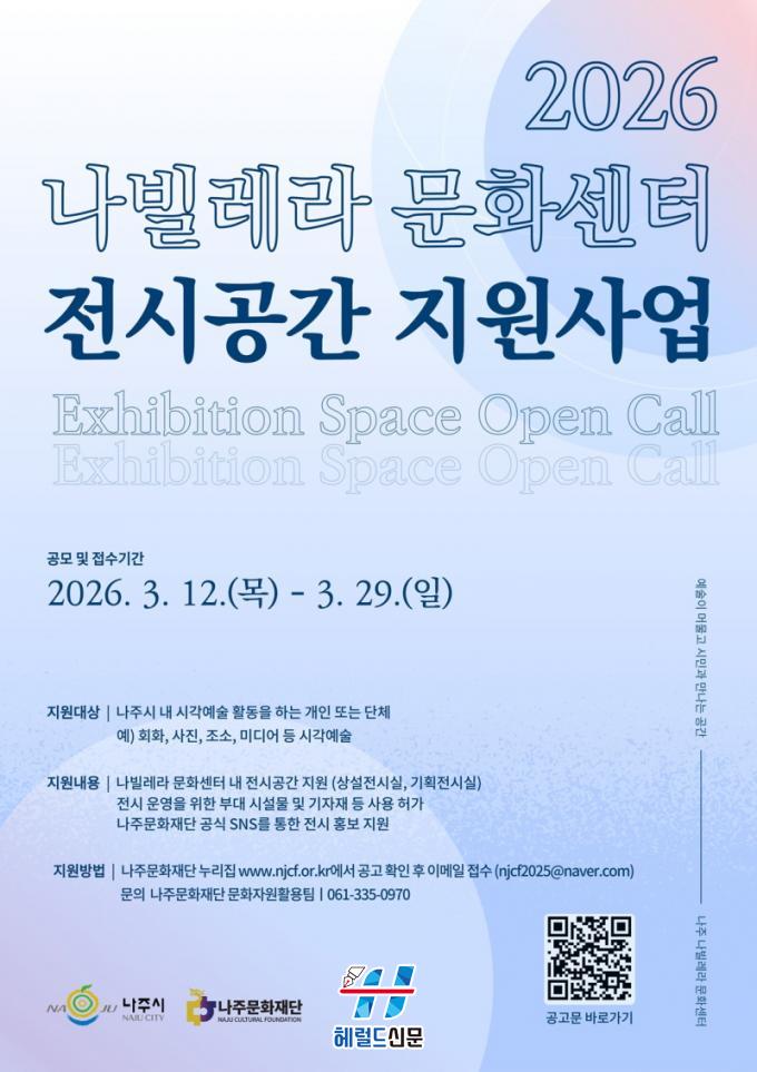 ³ªÁÖ¹®ÈÀç´ÜÀº ¿À´Â 3¿ù 29ÀϱîÁö Áö¿ª ½Ã°¢¿¹¼ú ÀÛ°¡¿Í ´Üü¸¦ ´ë»óÀ¸·Î ³ªºô·¹¶ó¹®È¼¾ÅÍ ³» Àü½Ã°ø°£À» ¹«»óÀ¸·Î Áö¿øÇÏ´Â °ø¸ð»ç¾÷À» ÁøÇàÇÑ´Ù°í 13ÀÏ ¹àÇû´Ù.