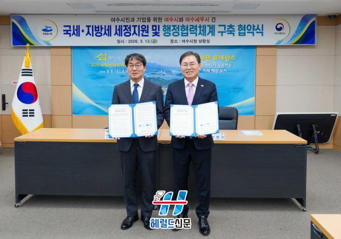 [Çì·²µå½Å¹® = ³ë½Â¾ð ±âÀÚ] ¿©¼ö½Ã°¡ ¿©¼ö¼¼¹«¼(¼Àå ±èÈÆ)¿Í 13ÀÏ ¿©¼ö½Ãû »óȲ½Ç¿¡¼ ¡®±¹¼¼¡¤Áö¹æ¼¼ ¼¼Á¤ Áö¿ø ¹× ÇàÁ¤ Çù·Âü°è ±¸ÃàÀ» À§ÇÑ ¾÷¹«Çù¾à(MOU)¡¯À» ü°áÇß´Ù°í ¹àÇû´Ù.