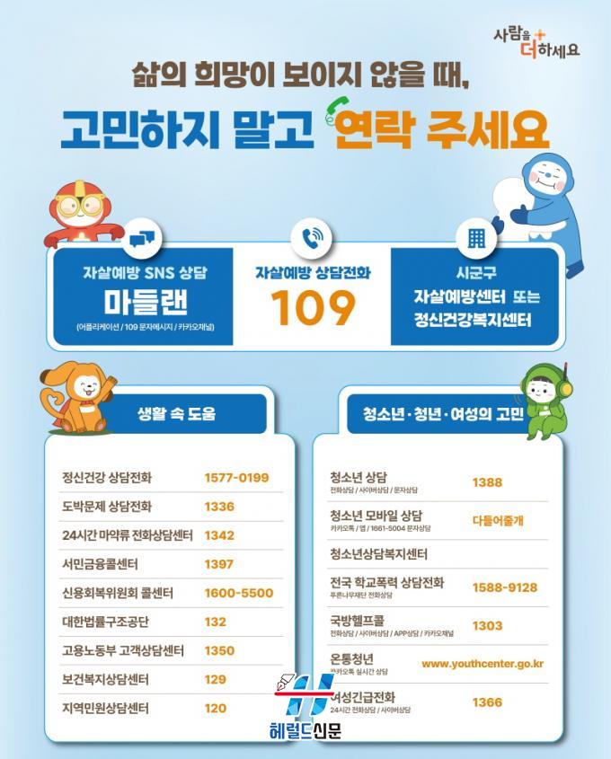 ¶ÇÇÑ µµ¹ÎÀÌ ½±°Ô µµ¿òÀ» ¹Þµµ·Ï Àڻ쿹¹æ »ó´ãÀüÈ ¡®109¡¯¿Í Á¤½Å°Ç° »ó´ãÀüÈ ¡®1577-0199¡¯ µî À§±â »ó´ã ¼ºñ½º¸¦ Àû±Ø ¾È³»Çϰí, ½Ã±º Á¤½Å°Ç°º¹Áö¼¾ÅÍ¿Í ¿¬°èÇØ °íÀ§Ç豺 »ó´ã°ú »ç·Ê°ü¸®¸¦ °ÈÇÑ´Ù.