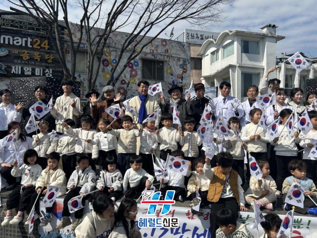 À̳¯ ´ëÇü űر⸦ ¼±µÎ·Î Çà»ç¿¡ Âü¿©ÇÑ Ã»¼Ò³â µî ½Ã¹ÎµéÀº °¢ÀÚ Å±ر⸦ µé°í ½ÅÈï°í¿¡¼ dz³²¹® ±¤Àå±îÁö ¡®´ëÇѵ¶¸³ ¸¸¼¼¡¯¸¦ ¿ÜÄ¡¸ç ±×³¯ÀÇ ¶ß°Å¿î ÇÔ¼º°ú űر⠹°°áÀ» ÀçÇöÇß´Ù.