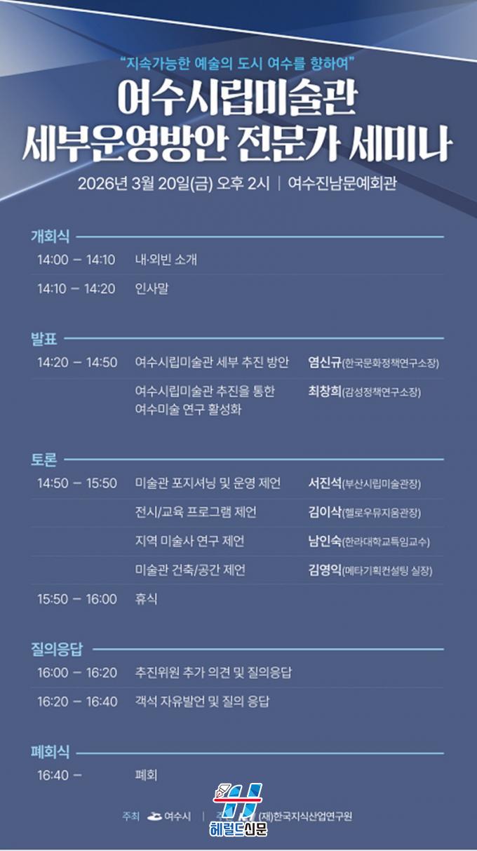 [Çì·²µå½Å¹® = ³ë½Â¾ð ±âÀÚ] ¿©¼ö½Ã´Â ¿À´Â 3¿ù 20ÀÏ ¿ÀÈÄ 2½Ã Áø³²¹®¿¹È¸°ü¿¡¼ ¡®¿©¼ö½Ã¸³¹Ì¼ú°ü °Ç¸³ ¼¼ºÎ¿î¿µ¹æ¾È Àü¹®°¡ Åä·Ðȸ(¼¼¹Ì³ª)¡¯¸¦ °³ÃÖÇÑ´Ù°í ¹àÇû´Ù.