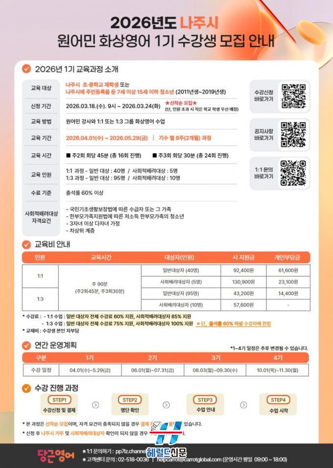 ³ªÁֽô ¿À´Â 3¿ù 18ÀϺÎÅÍ 24ÀϱîÁö °ü³» ÃÊ‧ÁßÇлýÀ» ´ë»óÀ¸·Î ¡®2026³â ³ªÁֽà ¿ø¾î¹Î Ȼ󿵾î 1±â¡¯ ¼ö°»ý 150¸íÀ» ¸ðÁýÇÑ´Ù°í 17ÀÏ ¹àÇû´Ù.