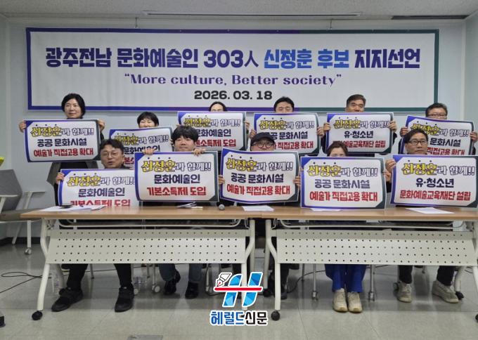 [Çì·²µå½Å¹® = ³ë½Â¾ð ±âÀÚ] ±¤ÁÖ¡¤Àü³² ¹®È¿¹¼úÀÎ 303¸íÀÌ ±âÀÚȸ°ßÀ» ¿°í, ½ÅÁ¤ÈÆ È帰¡ °¡Áø ¹®È¿¹¼ú °ü·Ã °ø¾àÀÌ °¡Àå ½ÇÈ¿¼º ÀÖ´Ù¸ç Èĺ¸ ÁöÁö¸¦ °ø½Ä ¼±¾ðÇß´Ù.