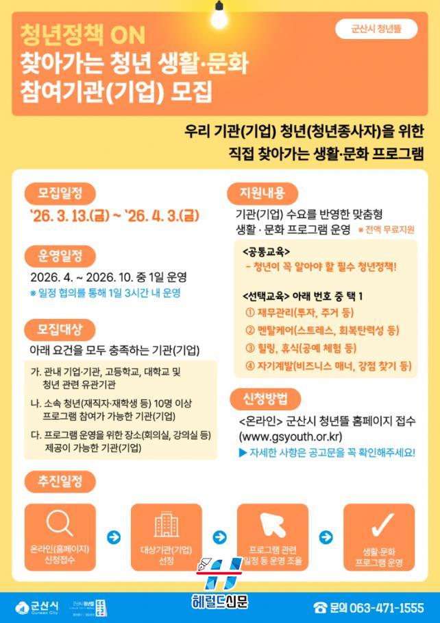 [Çì·²µå½Å¹® = ³ë½Â¾ð ±âÀÚ] ±º»ê½Ã´Â û³âÀÇ ÀÏ¡¤»ýȰ ±ÕÇüÀ» Áö¿øÇϰí ÇöÀå Áß½ÉÀÇ Á¤Ã¥ ü°¨À» ³ôÀ̱â À§ÇØ ¡®Ã»³âÁ¤Ã¥ ON: ã¾Æ°¡´Â û³â »ýȰ¡¤¹®È¡¯ ÇÁ·Î±×·¥¿¡ Âü¿©ÇÒ ±â°ü(±â¾÷)À» 4¿ù 3ÀϱîÁö ¸ðÁý ÁßÀ̶ó°í ¹àÇû´Ù.