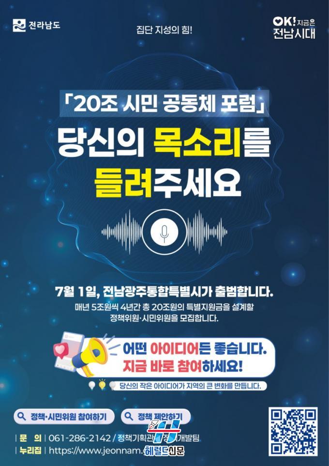 20Á¶ ½Ã¹Î°øµ¿Ã¼ Æ÷·³ ½Ã¹Î¡¤Á¤Ã¥À§¿ø Âü¿©¿Í Á¤Ã¥ Á¦¾ÈÀº Àü³²µµ ´©¸®Áý(www.jeonnam.go.kr)¿¡¼ Âü¿©¡¤Á¢¼öÇÒ ¼ö ÀÖ´Ù.