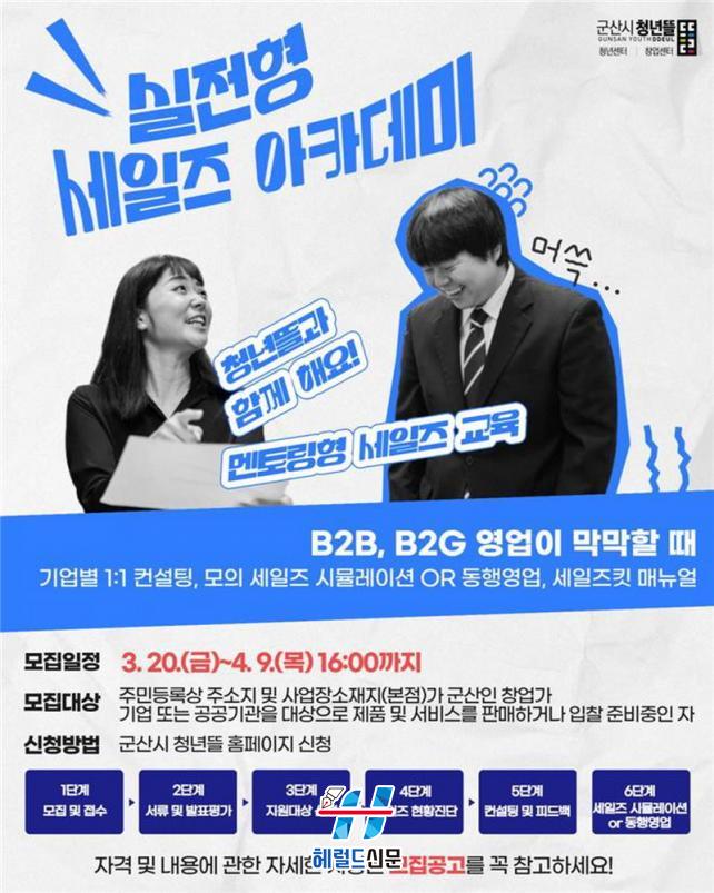 [Çì·²µå½Å¹® = ³ë½Â¾ð ±âÀÚ] ±º»ê½Ã û³â¶ã â¾÷¼¾ÅÍ(ÀÌÇÏ Ã¢¾÷¼¾ÅÍ)´Â ±â¾÷ °£ °Å·¡(B2B) ¹× °ø°ø±â°ü ´ë»ó °Å·¡(B2G) ½ÃÀå ÁøÃâ¿¡ ¾î·Á¿òÀ» °Þ´Â Áö¿ª â¾÷±â¾÷À» ´ë»óÀ¸·Î ¡®2026³â ½ÇÀüÇü ¼¼ÀÏÁî ¾ÆÄ«µ¥¹Ì¡¯ Âü¿©ÀÚ¸¦ 4¿ù 9ÀÏ 16½Ã±îÁö ¸ðÁýÇÑ´Ù.