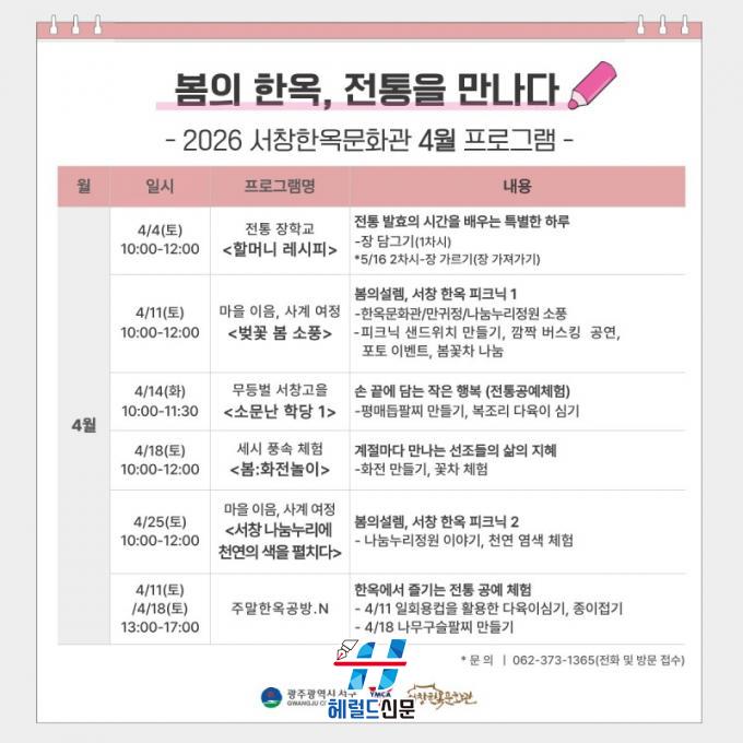 [Çì·²µå½Å¹® = ³ë½Â¾ð ±âÀÚ] ±¤ÁÖ±¤¿ª½Ã ¼±¸(±¸Ã»Àå ±èÀ̰)°¡ µµ½É ¼Ó ÇÑ¿Á¿¡¼ º½ÀÇ Á¤Ãë¿Í ÀüÅ빮ȸ¦ ÇÑÀÚ¸®¿¡¼ Áñ±æ ¼ö Àִ Ưº°ÇÑ °æÇèÀ» ¼±»çÇÑ´Ù. ¼±¸´Â 4¿ù ÇÑ ´Þ°£ ¼Ã¢ÇÑ¿Á¹®È°ü¿¡¼ ¡®º½ÀÇ ÇÑ¿Á, ÀüÅëÀ» ¸¸³ª´Ù¡¯¸¦ ÁÖÁ¦·Î ÀüÅë¹®È ÇÁ·Î±×·¥À» ¿î¿µÇÑ´Ù.