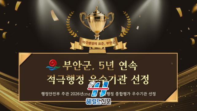 [Çì·²µå½Å¹® = ³ë½Â¾ð ±âÀÚ] ºÎ¾È±ºÀº ÇàÁ¤¾ÈÀüºÎ¿¡¼ ÁÖ°üÇÑ 2026³â(2025³â ½ÇÀû) Áö¹æÁ¤ºÎ Àû±ØÇàÁ¤ Á¾ÇÕÆò°¡¿¡¼ ¿ì¼ö±â°üÀ¸·Î ¼±Á¤µÅ Áö³ 2021³â ÇϹݱ⠼º°ú Á¡°ËºÎÅÍ 5³â ¿¬¼Ó ¿ì¼ö±â°ü ¼±Á¤À̶ó´Â ±ÝÀÚžÀ» ½×¾Ò´Ù°í ¹àÇû´Ù.