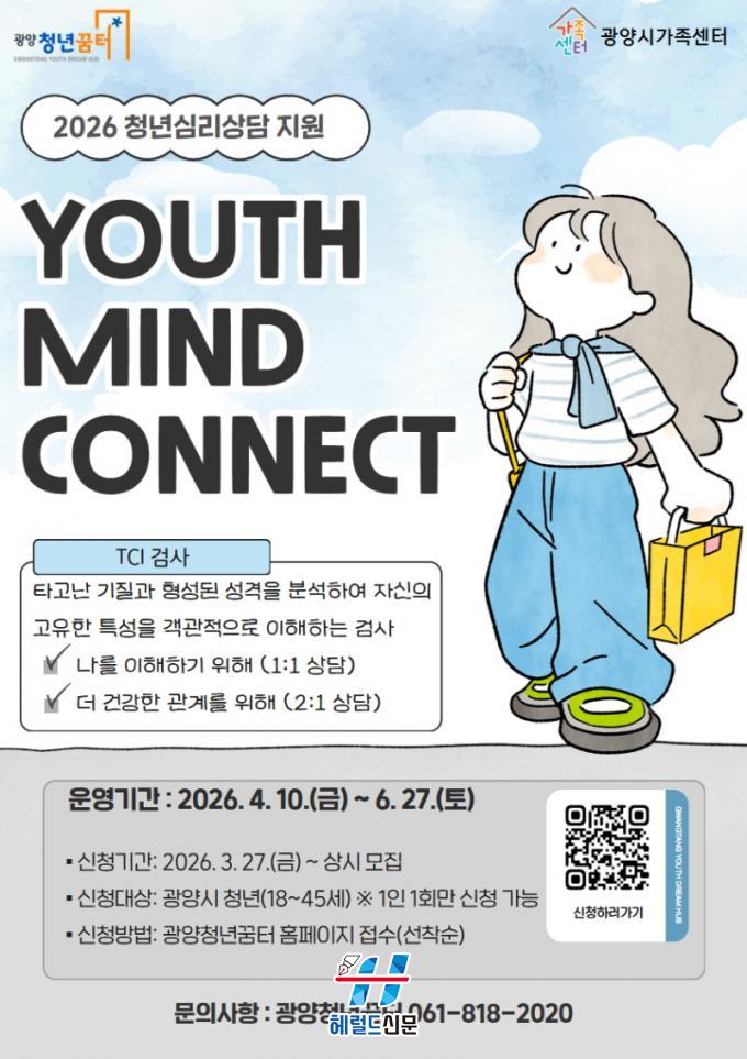 [Çì·²µå½Å¹® = ³ë½Â¾ð ±âÀÚ] ±¤¾ç½Ã´Â ¿À´Â 27ÀϺÎÅÍ Ã»³âÀÇ Á¤¼ ¾ÈÁ¤°ú °Ç°ÇÑ °ü°è Çü¼ºÀ» Áö¿øÇϱâ À§ÇØ ½É¸®»ó´ã ÇÁ·Î±×·¥ ¡¸YOUTH MIND CONNECT¡¹ Âü¿©ÀÚ¸¦ ¸ðÁýÇÑ´Ù°í ¹àÇû´Ù. À̹ø »ç¾÷Àº û³âÀÇ ¸¶À½°Ç° ȸº¹°ú ÀÚ±âÀÌÇØ ÁõÁøÀ» ÅëÇØ ¾ÈÁ¤ÀûÀÎ »îÀÇ ±â¹ÝÀ» ¸¶·ÃÇÏ´Â µ¥ ¸ñÀûÀÌ ÀÖ´Ù.