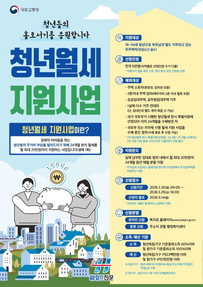 º» »ç¾÷Àº Áְźñ ºÎ´ãÀ¸·Î °æÁ¦Àû ¾î·Á¿òÀ» °Þ´Â Àú¼Òµæ µ¶¸³ û³â°¡±¸ÀÇ ¿ù¼¼¸¦ ÃÖ´ë 480¸¸ ¿ø(¿ù ÃÖ´ë 20¸¸ ¿ø)±îÁö ÃÖÀå 24°³¿ù°£ ¸Å¿ù ºÐÇÒ Áö¿øÇÏ´Â ±¹Åä±³ÅëºÎ ÁÖ°ü »ç¾÷ÀÌ´Ù.