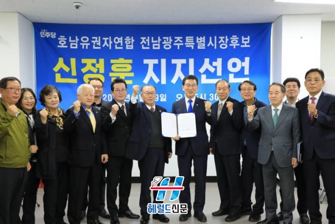 È£³²À¯±ÇÀÚ¿¬ÇÕ(»óÀÓ´ëÇ¥ À̰üÇü)Àº 29ÀÏ ½ÅÁ¤ÈÆ °æ¼±Áغñ ±¤Áֻ繫½Ç¿¡¼ ¡®Àü³²±¤ÁÖÅëÇÕÆ¯º°½ÃÀå Èĺ¸ ÁöÁö ¼±¾ð½Ä¡¯À» °®°í, ÃÊ´ë ÅëÇÕÆ¯º°½ÃÀå È帷Π½ÅÁ¤ÈÆÀ» ÁöÁöÇÑ´Ù°í ¼±¾ðÇß´Ù.
