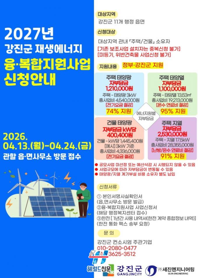 [Çì·²µå½Å¹® = Àü¿µ±Ô ±âÀÚ] °Áø±ºÀÌ ±âÈÄ¿¡³ÊÁöȯ°æºÎ¿Í Çѱ¹¿¡³ÊÁö°ø´ÜÀÌ ÁÖ°üÇÏ´Â ¡®2027³â ½ÅÀç»ý¿¡³ÊÁö À¶º¹ÇÕÁö¿ø»ç¾÷¡¯ °ø¸ð ½ÅûÀ» À§ÇÑ ¼ö¿äÁ¶»ç¸¦ ¿À´Â 4¿ù 13ÀϺÎÅÍ 4¿ù 24ÀϱîÁö ½Ç½ÃÇÑ´Ù.
