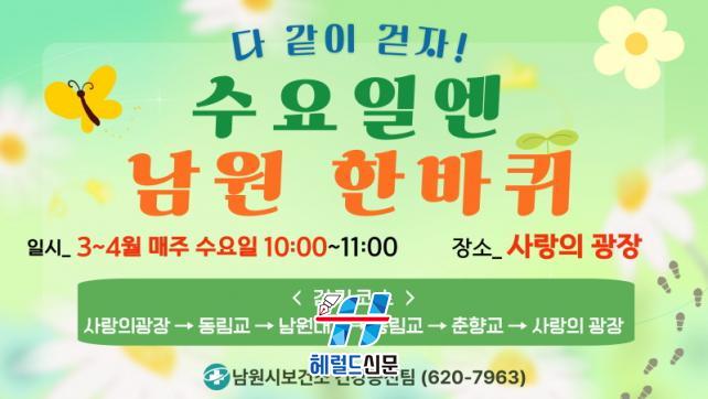 [Çì·²µå½Å¹® = ³ë½Â¾ð ±âÀÚ] ³²¿ø½Ãº¸°Ç¼Ò(¼ÒÀå ÇÑ¿ëÀç)°¡ ½Ã¹ÎÀÇ °Ç° ÁõÁø°ú ÀÏ»ó ¼Ó ¿îµ¿ ½À°ü Çü¼ºÀ» À§ÇØ ¿À´Â 4¿ùºÎÅÍ 11¿ù±îÁö °È±â ½Çõ ÇÁ·Î±×·¥ÀÎ ¡®¼ö¿äÀÏ¿£ ³²¿ø ÇѹÙÄû¡¯¸¦ ¿î¿µÇÑ´Ù.
