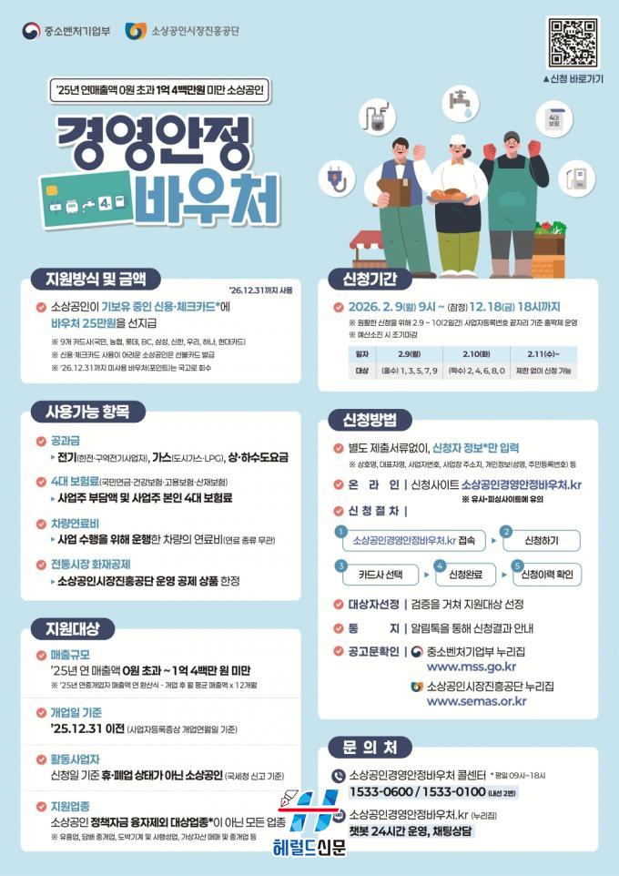 Áö¿ø ´ë»óÀº 2025³â ±âÁØ ¿¬ ¸ÅÃâ¾× 1¾ï 4¹é¸¸¿ø ¹Ì¸¸ÀÇ ¼Ò»ó°øÀÎÀ¸·Î, ½ÅûÀÏ ±âÁØ Á¤»ó ¿µ¾÷ ÁßÀÎ »ç¾÷ÀÚ¶ó¸é ´ëºÎºÐ ½ÅûÀÌ °¡´ÉÇÏ´Ù. ¾÷Á¾ Á¦ÇÑÀÌ ÀϺΠÀÖÀ¸³ª ÀϹÝÀûÀÎ ÀÚ¿µ¾÷ÀÚ´Â Æø³Ð°Ô Áö¿ø ´ë»ó¿¡ Æ÷ÇԵǾî Á¤Ã¥ ü°¨µµ¸¦ ³ô¿´´Ù.