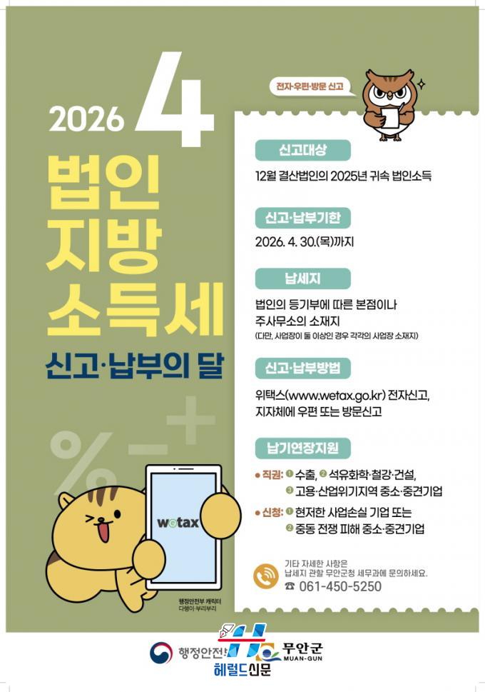 [Çì·²µå½Å¹® = Àü¿µ±Ô ±âÀÚ] ¹«¾È±ºÀº ¹ýÀÎ ¼Òµæ¿¡ ´ëÇØ Áö¹æÀÚÄ¡´Üü¿¡ ³³ºÎÇÏ´Â ¹ýÀÎÁö¹æ¼Òµæ¼¼ ½Å°í¡¤³³ºÎ ±â°£À» ¸Â¾Æ ¿À´Â 4¿ù 30ÀϱîÁö ÁýÁ߽Űí±â°£À» ¿î¿µÇÑ´Ù°í ¹àÇû´Ù.