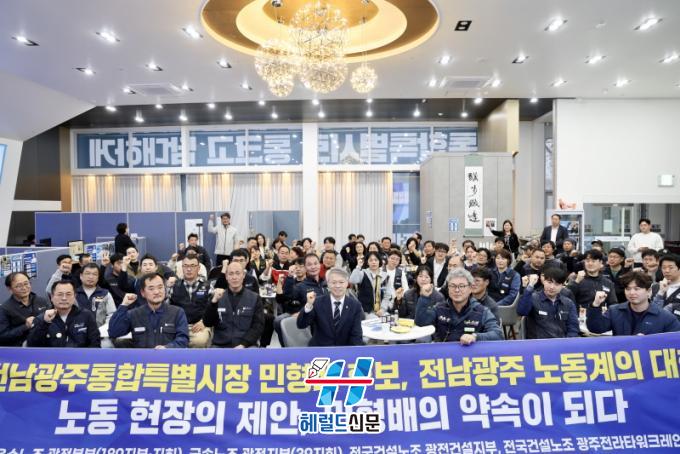 [Çì·²µå½Å¹® = ³ë½Â¾ð ±âÀÚ] Àü³²±¤ÁÖ Áö¿ª °ø°ø¿î¼ö³ëÁ¶¿Í ±Ý¼Ó³ëÁ¶¸¦ ºñ·ÔÇÑ ¹ÎÁÖ³ëÃÑ ¼Ò¼Ó 20¿© °³ ³ëµ¿Á¶ÇÕ ´ëÇ¥ÀÚ¿Í °£ºÎ µî 80¿© ¸íÀÌ ´õºÒ¾î¹ÎÁÖ´ç Àü³²±¤ÁÖÅëÇÕÆ¯º°½ÃÀå °æ¼± Èĺ¸ÀÎ ¹ÎÇü¹è ±¹È¸ÀÇ¿ø(±¤ÁÖ ±¤»ê±¸À»)À» ã¾Æ ÅëÇÕÆ¯º°½ÃÀÇ ½ÇÁúÀûÀÎ ³ëµ¿±Ç º¸ÀåÀ» À§ÇÑ Á¤Ã¥ Á¦¾È ¹× Çù·Â ¹æ¾ÈÀ» ³íÀÇÇß´Ù.