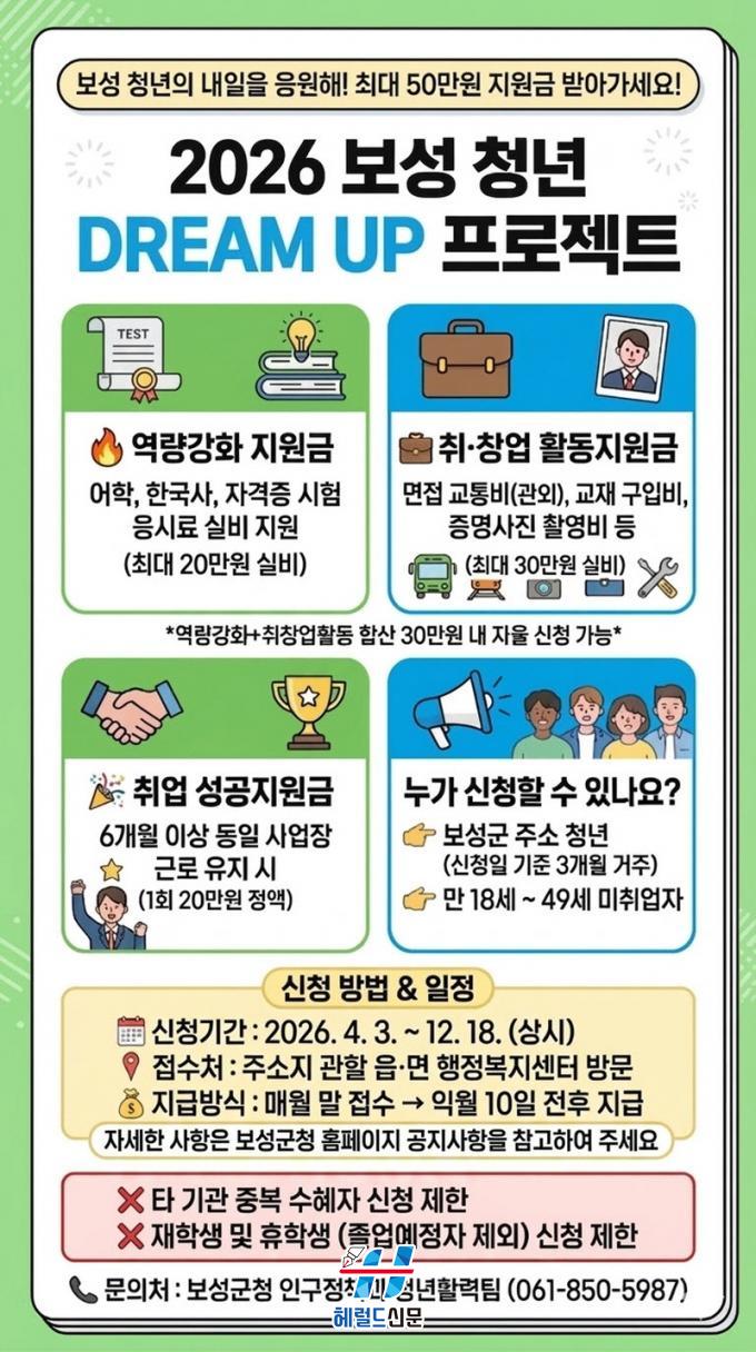 [Çì·²µå½Å¹® = Àü¿µ±Ô ±âÀÚ] º¸¼º±ºÀº °íÇâ»ç¶û±âºÎÁ¦·Î Á¶¼ºµÈ ±â±Ý 6,000¸¸ ¿øÀ» Ȱ¿ëÇØ Áö¿ª û³âÀÇ Ãë¾÷¡¤Ã¢¾÷À» Áö¿øÇÏ´Â ¡®2026³â º¸¼º û³â DREAM UP ÇÁ·ÎÁ§Æ®¡¯¸¦ º»°Ý ÃßÁøÇÑ´Ù°í ¹àÇû´Ù.
