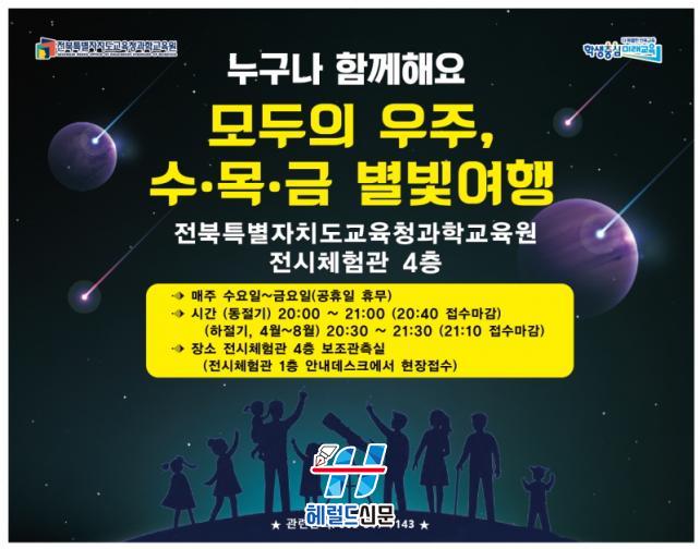 [Çì·²µå½Å¹® = Àü¿µ±Ô ±âÀÚ] ÀüºÏƯº°ÀÚÄ¡µµ±³À°Ã»°úÇб³À°¿ø(¿øÀå °Áø¼ø, ÀÌÇÏ °úÇб³À°¿ø)Àº 4¿ù °úÇÐÀÇ ´Þ°ú º½À» ¸ÂÀÌÇØ µµ¹Îµé¿¡°Ô ¹ãÇÏ´ÃÀÇ ½Åºñ·Î¿òÀ» ¼±»çÇϰíÀÚ ¡®º½Ã¶ º°ÀÚ¸®¿Í ÇÔ²²ÇÏ´Â ¼ö¡¤¸ñ¡¤±Ý º°ºû¿©Ç࡯À» ¿î¿µÇÑ´Ù.