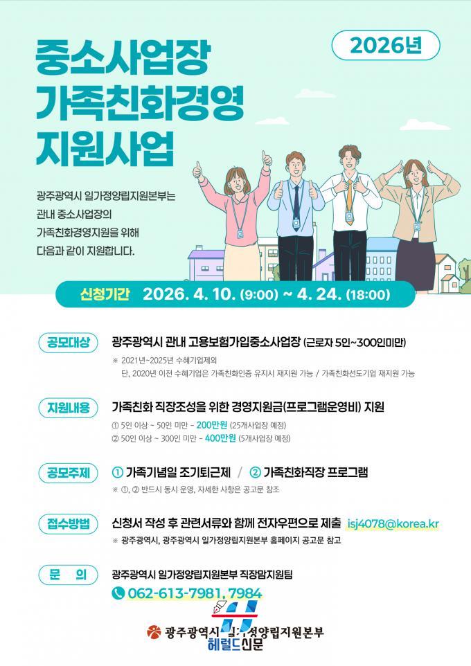[Çì·²µå½Å¹® = ³ë½Â¾ð ±âÀÚ] ±¤ÁÖ±¤¿ª½Ã Àϰ¡Á¤¾ç¸³Áö¿øº»ºÎ´Â ¡®2026³â °¡Á·Ä£È°æ¿µ Áö¿ø»ç¾÷¡¯¿¡ Âü¿©ÇÒ Áö¿ª Áß¼Ò»ç¾÷Àå 30°÷À» ¿À´Â 10ÀϺÎÅÍ 24ÀϱîÁö ¸ðÁýÇÑ´Ù.