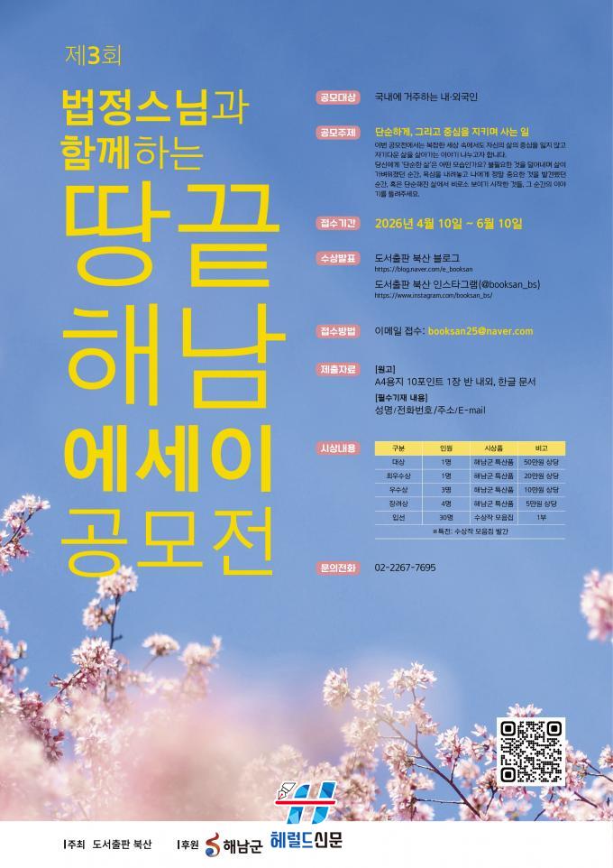 ÇØ³²±ºÀº ¡°¹ýÁ¤½º´ÔÀÇ °¡¸£Ä§Ã³·³ ´ú¾î³¿À» ÅëÇØ ¿ÀÈ÷·Á ´õ dz¿ä·Î¿öÁö´Â »îÀÇ °¡Ä¡¸¦ ¸¹Àº À̵é°ú ³ª´©°íÀÚ ÇÑ´Ù¡±¸ç ¡°À̹ø °ø¸ð¸¦ ÅëÇØ ÇØ³²ÀÇ ¹®ÈÀû °¡Ä¡¸¦ ÀçÁ¶¸íÇϰí, ¹ýÁ¤ ½º´ÔÀÇ ¹«¼ÒÀ¯ Á¤½ÅÀÌ ³Î¸® È®»êµÇ±â¸¦ ±â´ëÇÑ´Ù¡±°í ¹àÇû´Ù.