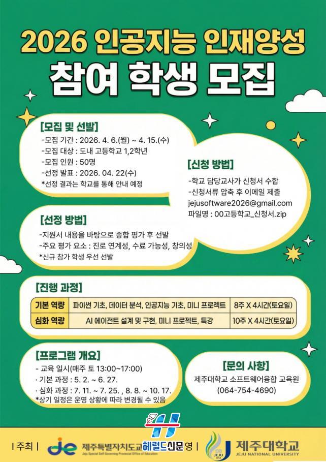 [Çì·²µå½Å¹® = ³ë½Â¾ð ±âÀÚ] Á¦ÁÖÆ¯º°ÀÚÄ¡µµ±³À°Ã»Àº 7ÀÏ ¹Ì·¡ ÀΰøÁö´É »çȸ¸¦ ¼±µµÇÒ À̰ø°è ÇÙ½É ÀÎÀç ¾ç¼ºÀ» À§ÇØ µµ³» °íµîÇб³ 1¡¤2Çгâ Çлý 50¸íÀ» ´ë»óÀ¸·Î¡®2026³â ÀΰøÁö´É(AI) ÀÎÀç ¾ç¼º ÇÁ·Î±×·¥¡¯À» ¿î¿µÇÑ´Ù°í ¹àÇû´Ù.