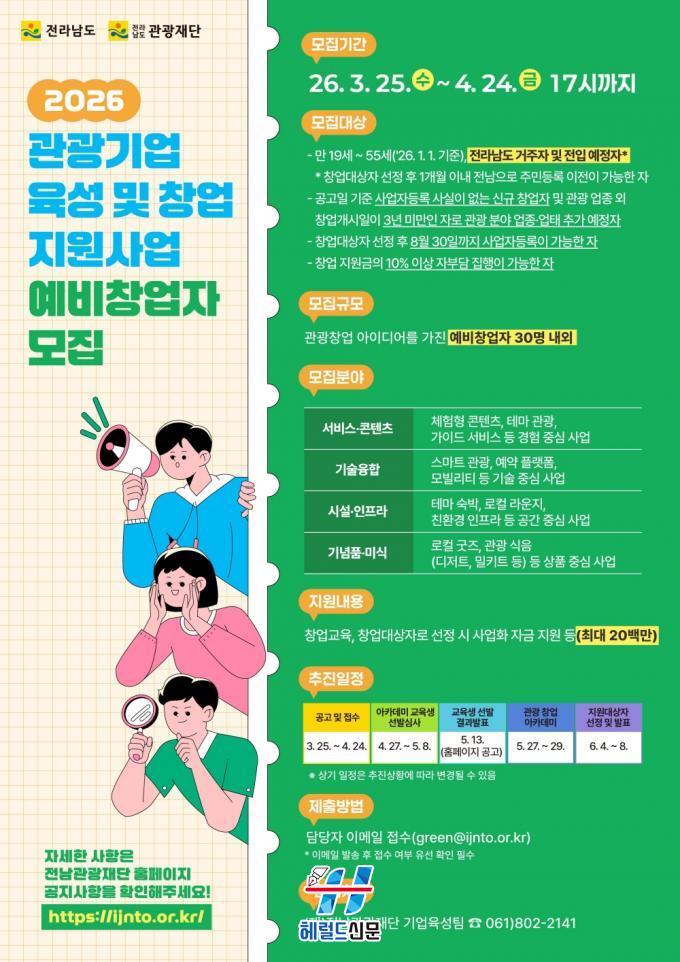 4¿ù 24ÀÏ ¿ÀÈÄ 5½Ã±îÁö À̸ÞÀÏ·Î Á¢¼öÇϸç, ÀÚ¼¼ÇÑ »çÇ×Àº Àü³²µµ(jeonnam.go.kr)¿Í Àü³²°ü±¤Àç´Ü(ijnto.or.kr) ´©¸®Áý¿¡¼ È®ÀÎÇÒ ¼ö ÀÖ´Ù.