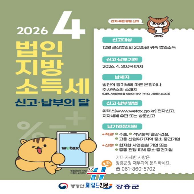 [Çì·²µå½Å¹® = Á¤¾ç¼® ±âÀÚ] ÀåÈﱺÀº 4¿ù ÇÑ ´Þ µ¿¾È 2025³â 12¿ù ¸» °á»ê¹ýÀÎÀÇ ¹ýÀμҵ濡 ´ëÇÑ ¹ýÀÎÁö¹æ¼Òµæ¼¼ ÁýÁß ½Å°í¡¤³³ºÎ ±â°£À» ¿î¿µÇÑ´Ù°í 9ÀÏ ¹àÇû´Ù.