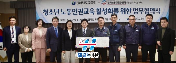 [Çì·²µå½Å¹® = ³ë½Â¾ð ±âÀÚ] Àü¶ó³²µµ±³À°Ã»(±³À°°¨ ±è´ëÁß)Àº 4¿ù 8ÀÏ Ã»»ç 5Ãþ ºñÁî´Ï½º½Ç¿¡¼ Çѱ¹³ëµ¿Á¶ÇÕÃÑ¿¬¸Í Àü³²º»ºÎ¿Í ¡®Ã»¼Ò³â ³ëµ¿À뱂 º¸È£¡¤ÁõÁø¡¯À» À§ÇÑ ¾÷¹«Çù¾àÀ» ü°áÇß´Ù.