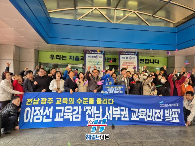 [Çì·²µå½Å¹® = ³ë½Â¾ð ±âÀÚ] ÀÌÁ¤¼± Àü³²±¤ÁÖÅëÇÕÆ¯º°½Ã±³À°°¨ ¿¹ºñÈ帰¡ 9ÀÏ ¸ñÆ÷±³À°Áö¿øÃ» ¾Õ¿¡¼ ±âÀÚȸ°ßÀ» ¿°í, Àü³² ¼ºÎ±ÇÀÇ ±³À° ¼öÁØÀ» ´ëµµ½Ã ¼öÁØÀ¸·Î ²ø¾î¿Ã¸®±â À§ÇÑ ¼ºÎ±Ç 5´ë ±³À°ºñÀüÀ» ¹ßÇ¥Çß´Ù.