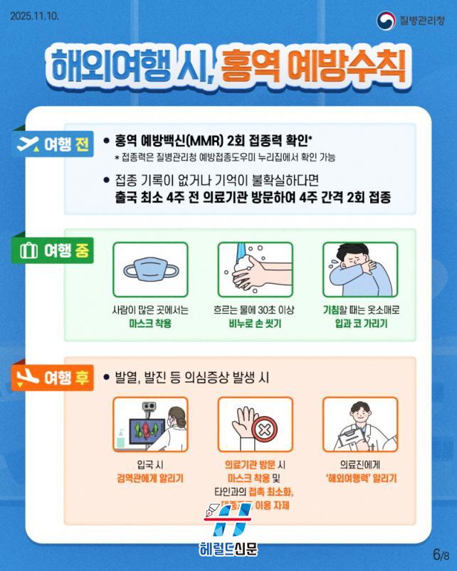 ´Ù¸¸, È«¿ªÀº ¿¹¹æÁ¢Á¾À¸·Î ÃæºÐÈ÷ ¿¹¹æÀÌ °¡´ÉÇÏ´Ù. ÀÌ¿¡ µû¶ó ÇØ¿Ü¿©Çà Àü MMR(È«¿ª¡¤À¯Ç༺ÀÌÇϼ±¿°¡¤Ç³Áø) ¿¹¹æÁ¢Á¾ 2ȸ ¿Ï·á ¿©ºÎ¸¦ È®ÀÎÇϰí, Á¢Á¾ ¿©ºÎ°¡ ºÒÈ®½ÇÇÑ °æ¿ì Ãâ±¹ ÃÖ¼Ò 4ÁÖ Àü ÀÇ·á±â°ü »ó´ãÀ» ÅëÇÑ ¿¹¹æÁ¢Á¾À» ±Ç°íÇÑ´Ù.