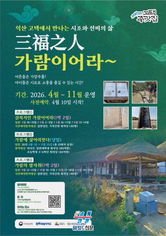 À̹ø ÇÁ·Î±×·¥Àº ±¹°¡À¯»êû °ø¸ð»ç¾÷ÀÎ '2026³â °íÅá¤Á¾°«Áý Ȱ¿ë»ç¾÷'ÀÇ ÀÏȯÀ¸·Î ¸¶·ÃµÆÀ¸¸ç ¡â»ïº¹ÁöÀÎ °¡¶÷À̾î¶ó ¡â°¡¶÷ÀÇ ¹ßÀÚÃë ¡â°¡¶÷¿¡ »ì¾î¸®¶ù´Ù µî 3°¡Áö·Î ÀÌ·ïÁ³´Ù.