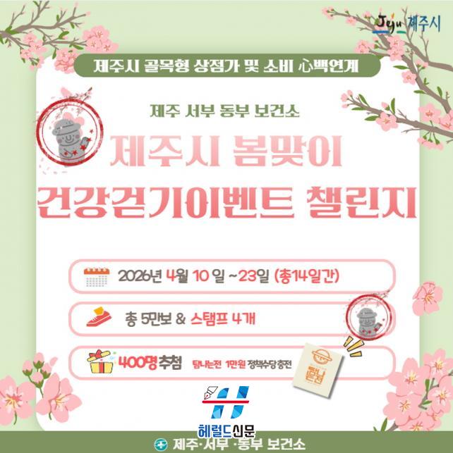 [Çì·²µå½Å¹® = ³ë½Â¾ð ±âÀÚ] Á¦ÁÖº¸°Ç¼Ò´Â º½Ã¶À» ¸Â¾Æ ½Ã¹ÎµéÀÇ °È±â ½ÇõÀ» Ȱ¼ºÈÇϱâ À§ÇØ 4¿ù 10ÀÏ(±Ý)ºÎÅÍ 4¿ù 23ÀÏ(¸ñ)±îÁö ¡®°ñ¸ñÇü »óÁ¡°¡ ¿¬°è º½¸ÂÀÌ °Ç° °È±â À̺¥Æ® 縰Áö¡¯¸¦ ¿î¿µÇÑ´Ù.